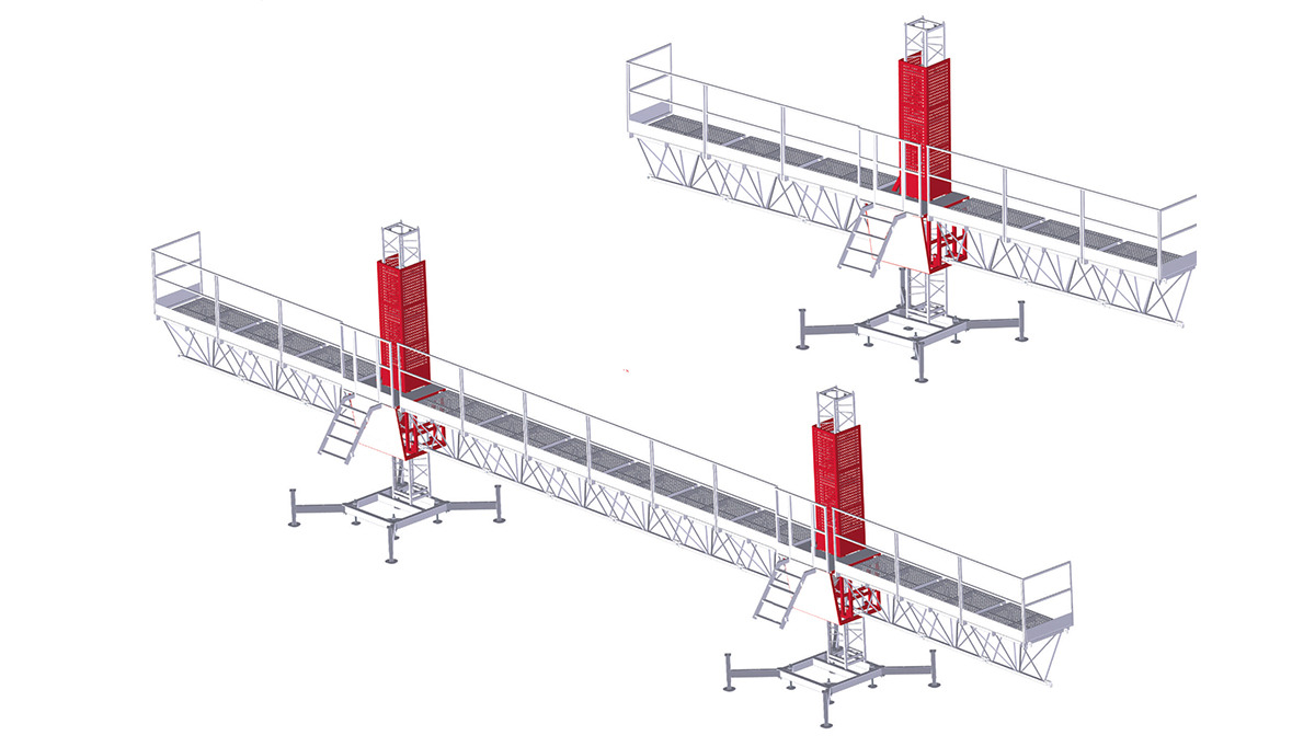 With a maximum working height of 150 meters, our platforms provide exceptional versatility. Double platforms can function as two separate single platforms with individual panels. Electric motors are equipped with a reducer-motor-electromagnetic brake system for reliable performance. For safety, a parachute brake system is employed, stopping the platform mechanically in case of motor failure.